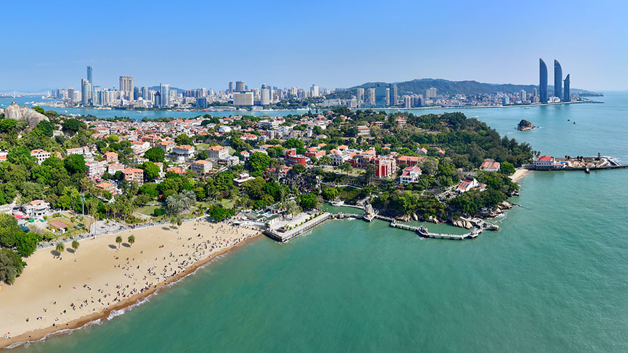 游人在厦门鼓浪屿沙滩上游玩(无人机照片)。