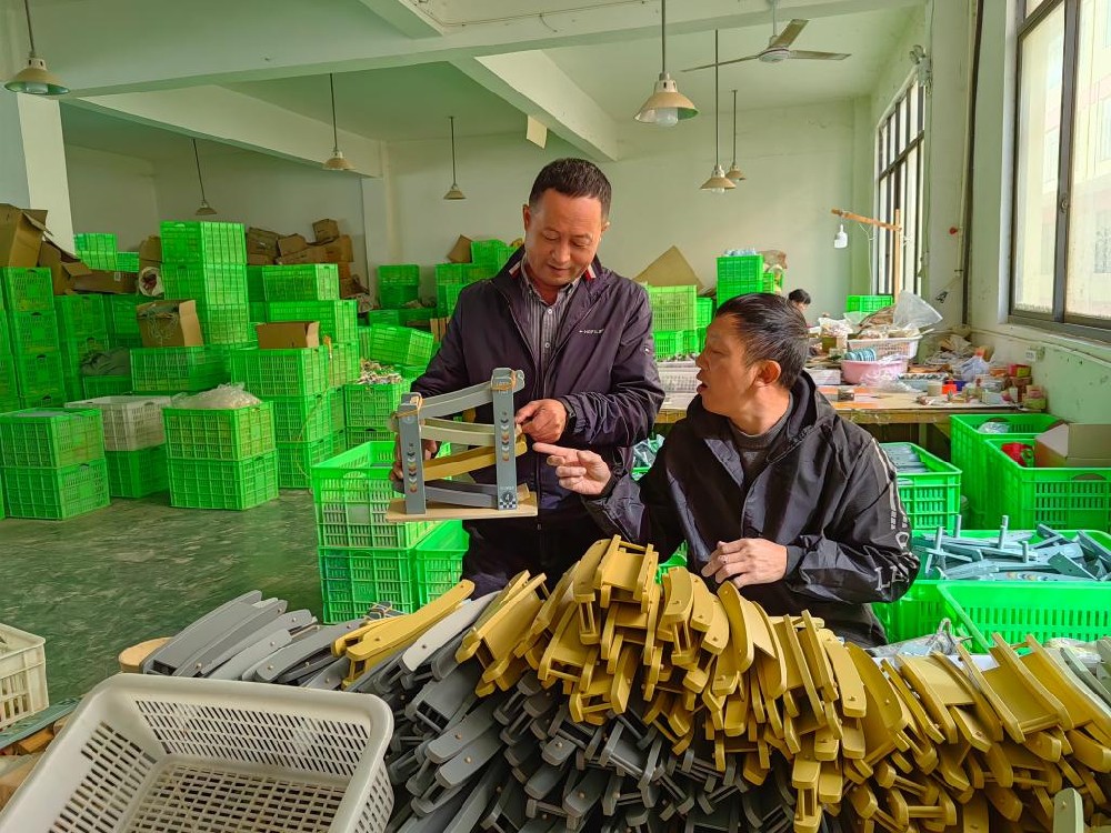 在自己创办的工厂里,李金龙(左一)指导员工包装玩具。(受访者供图)