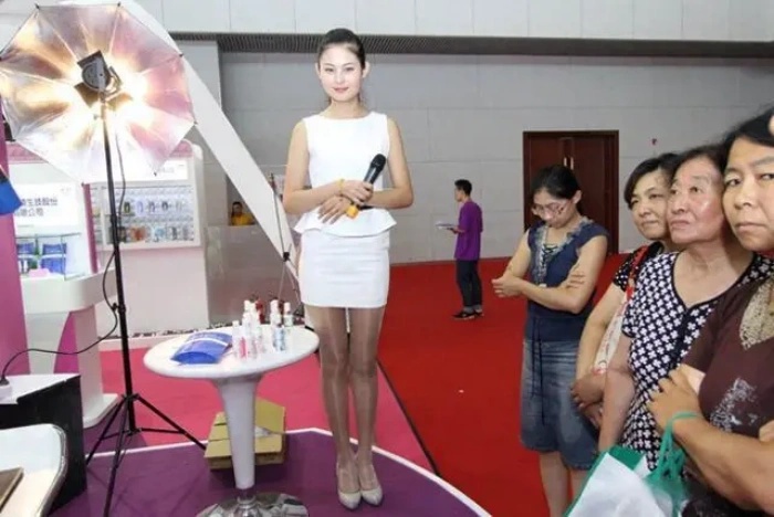 图为健康医美形象馆前一位美丽的模特吸引了许多爱美人士咨询。