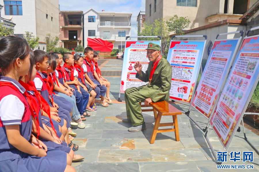 图为白九金老人在沿河村白梅纪念园文化广场前给参观学生讲述红色历史。