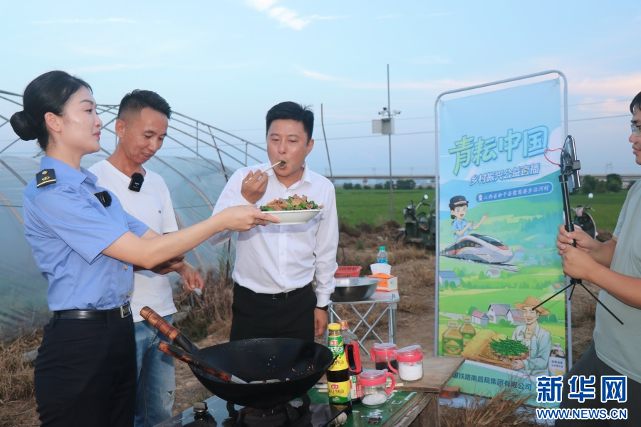 图为南昌铁路局驻村工作队长、第一书记连诚(左三)在进行直播带货,销售余干辣椒。