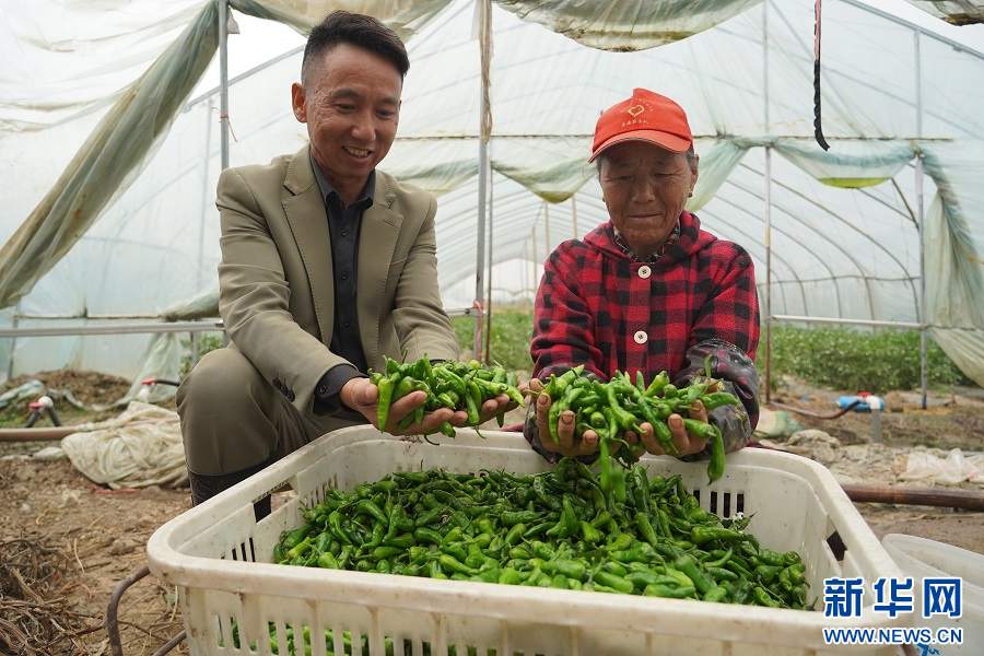 在江西省余干县沿河村蔬菜大棚,种植大户白军书(左)和村民一起查看刚采摘的辣椒。