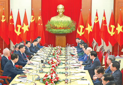当地时间十二月十二日下午,刚刚抵达河内的中共中央总书记、国家主席习近平在越共中央驻地同越共中央总书记阮富仲举行会谈。 |