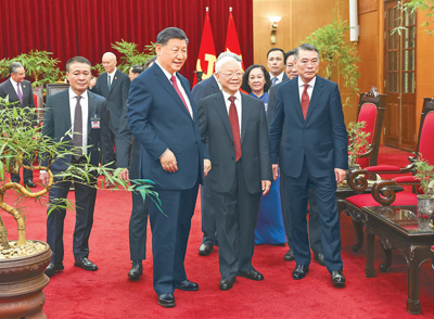 习近平强调,中越两国在各自争取国家独立和民族解放斗争中相互支持,在彼此改革开放和革新事业中互学互鉴,“越中情谊深、同志加兄弟”是中越关系最生动写照。中方始终从战略高度和长远角度看待中越关系。当前,世界之变、时代之变、历史之变正以前所未有的方式展开。中越两党作为世界前两大执政的共产党,都坚持和发展马克思主义,都坚定不移走社会主义道路,都在领导各自国家进行社会主义建设,更应该从壮大世界社会主义力量和确保各自社会主义建设事业行稳致远的高度,把握中越关系的特殊战略意义,扎实推进中越命运共同体建设。相信在双方共同努力下,中越关系将进入政治互信更高、安全合作更实、互利合作更深、民意基础更牢、多边协调配合更紧、分歧管控解决更好的新阶段,中越两国社会主义建设事业将不断取得新成就,并为地区乃至世界稳定、发展、繁荣作出新贡献。