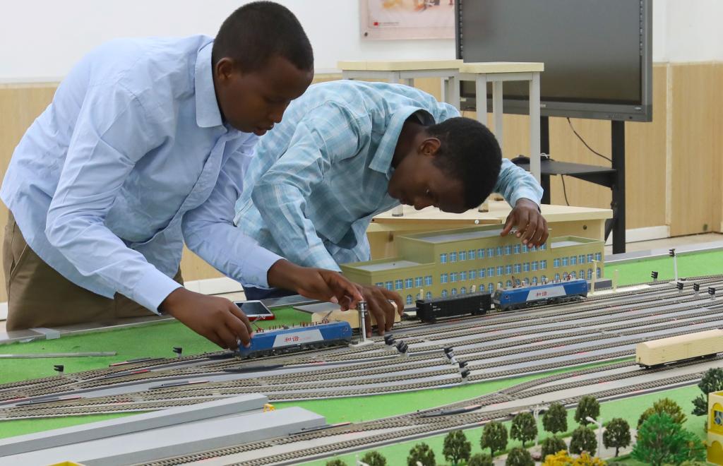 2022年9月19日,在位于吉布提首都吉布提市的吉布提工商学校,学生在鲁班工坊铁道运营沙盘教学区学习。