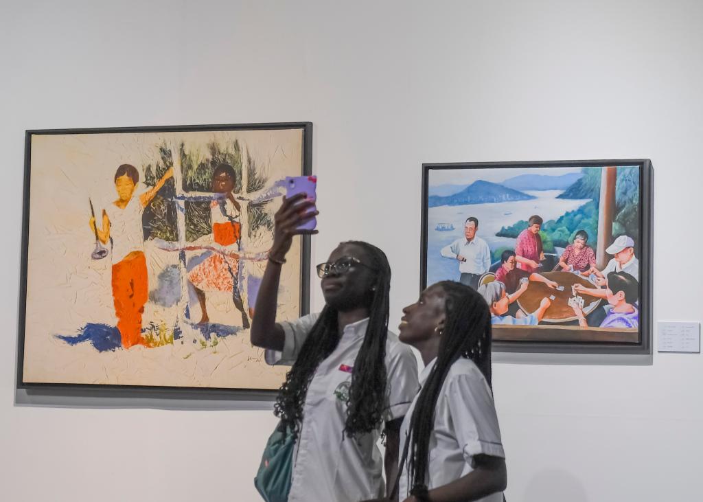 2023年5月12日,游客在塞内加尔首都达喀尔的黑人文明博物馆与展出画作合影。“隔洋相看——非洲画家笔下的中国”画展5月12日在这里开幕。
