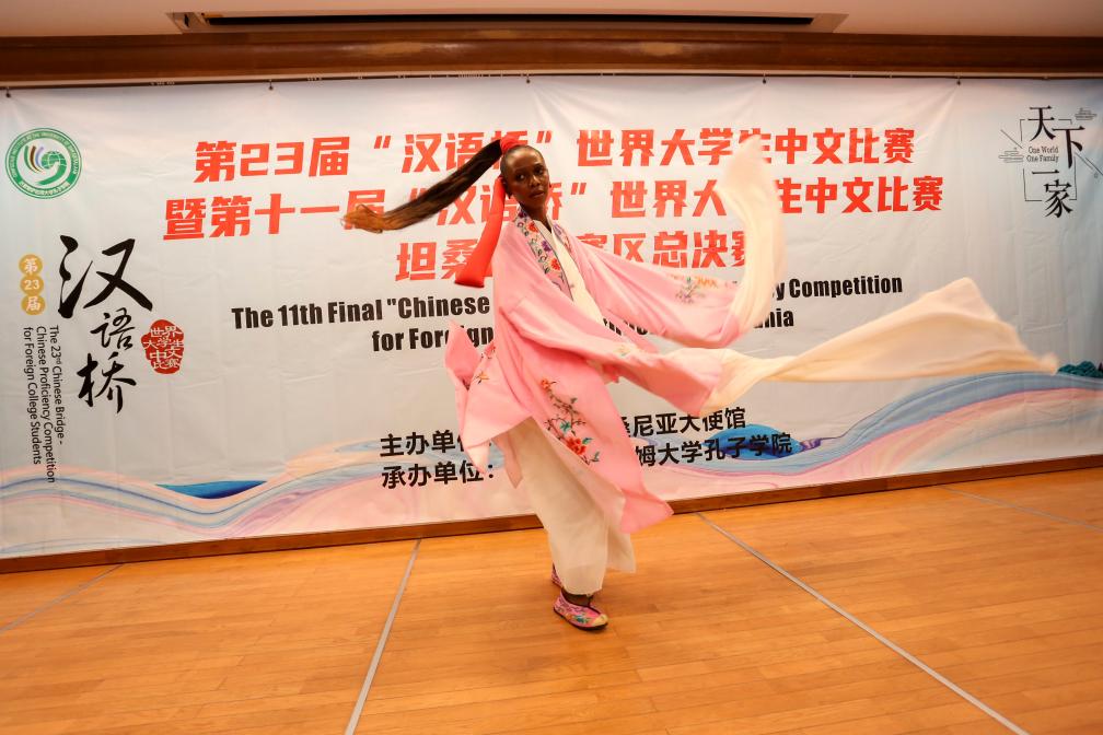 2024年5月22日,在坦桑尼亚达累斯萨拉姆,参赛者在“汉语桥”世界大学生中文比赛坦桑尼亚赛区决赛上展示才艺。