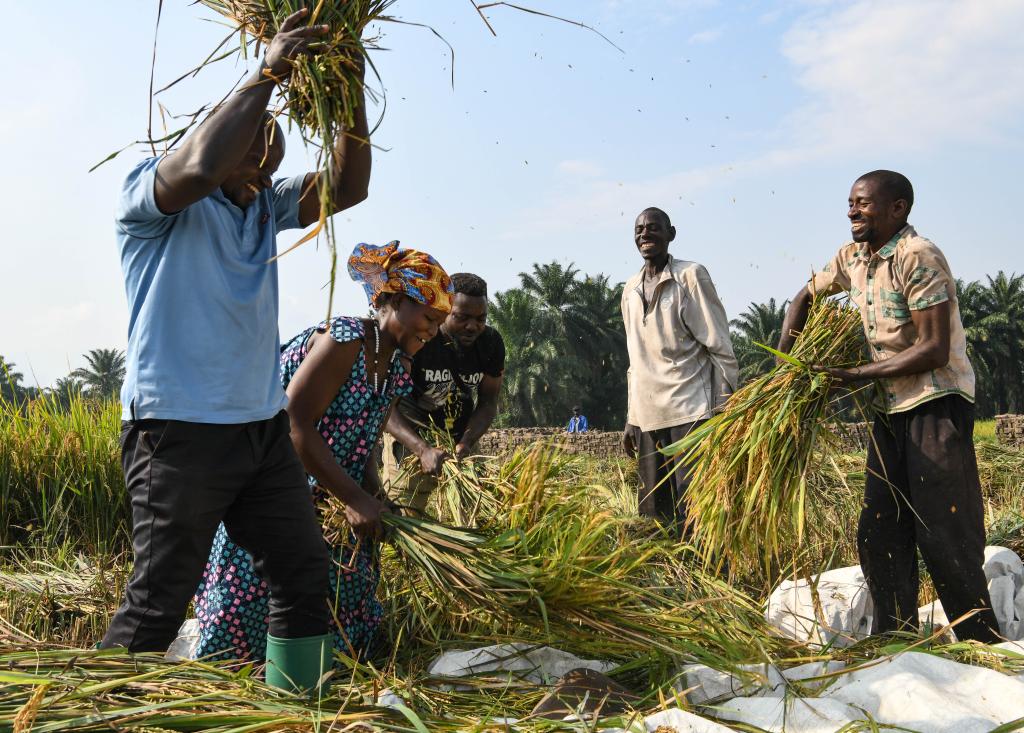 2023年6月20日,在布隆迪布班扎省基航加县,农民在田间给杂交水稻脱粒。多年来,中国派出农业专家深入布隆迪各地,对当地稻农提供技术指导,为粮食增产增收做出重要贡献。
